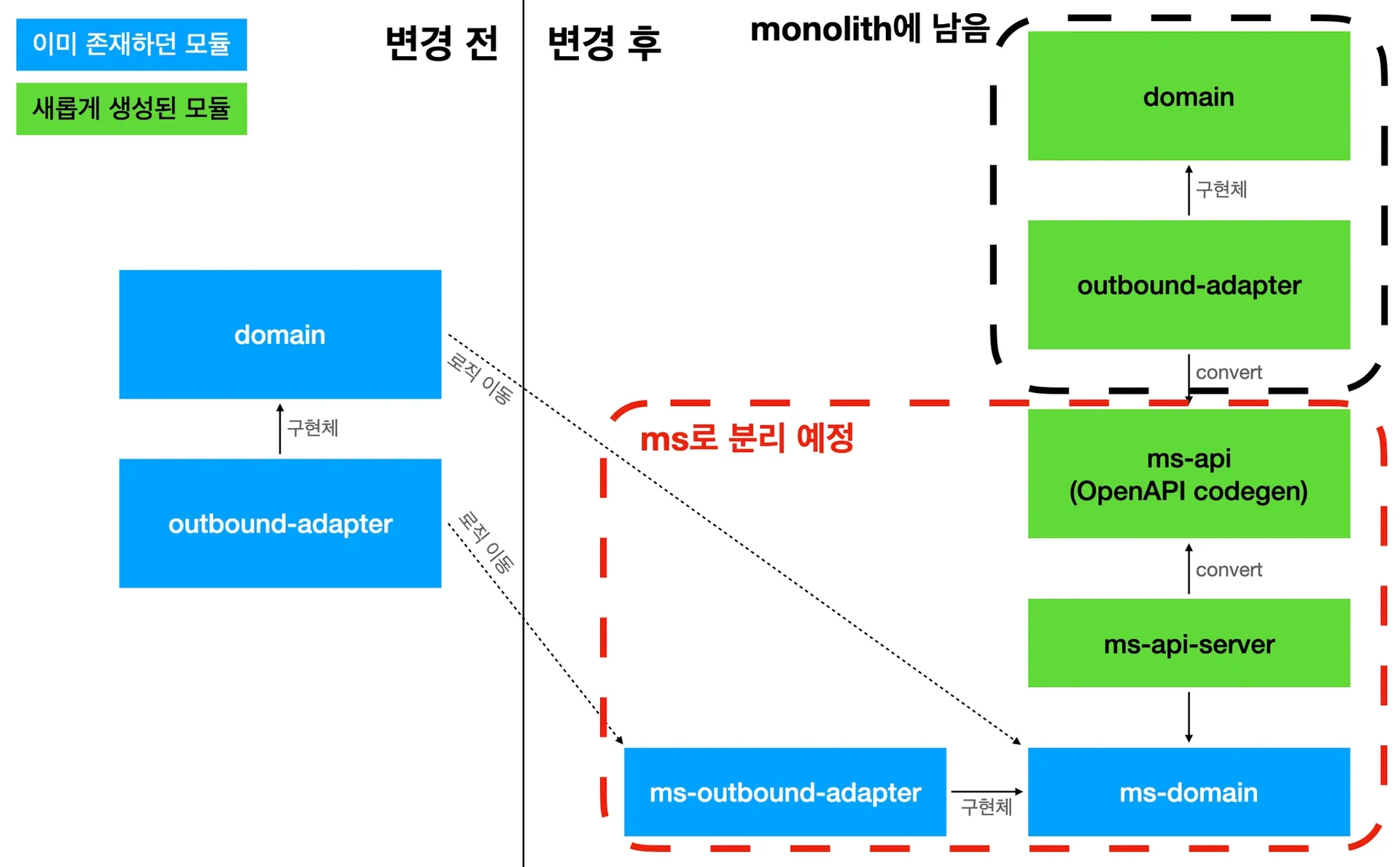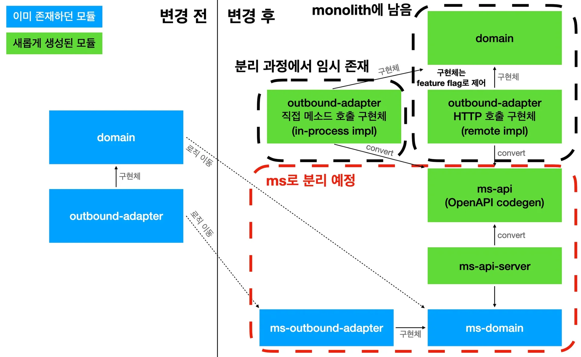ms를 분리할 때 이미 monolith 내부에서 호출되던 코드를 그대로 ms로 복사해서 분리하기 때문에, ms 분리 전후로 비즈니스 로직을 위한 코드(ms-domain, ms-outbound-adapter, ms-api-server, ms-api 모듈의 코드)가 달라지지 않습니다. 이는 ms 분리 전후의 동작이 동일함을 보장하는 데 큰 도움이 됩니다.