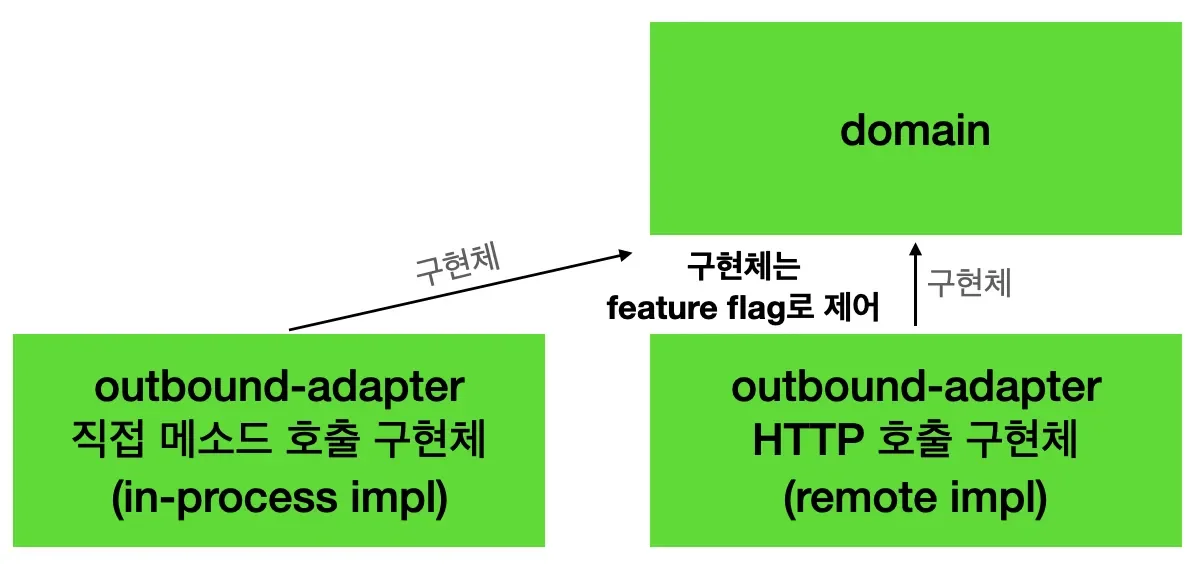 피처 플래그를 도입하면 STG는 remote impl을 사용해서 마이크로서비스 분리 작업에 대한 QA를 진행하고, PROD는 in-process impl을 사용하여 마이크로서비스 분리 작업의 영향이 없는 상태로 배포할 수 있습니다. 즉, 마이크로서비스 분리 작업에 대한 긴 QA가 배포 지연을 발생시키지 않습니다.