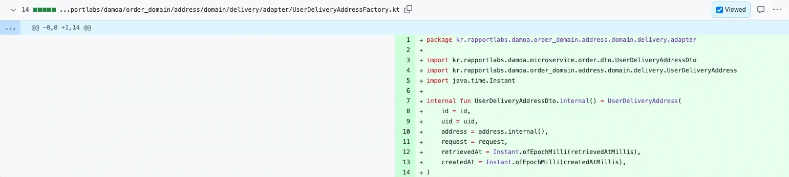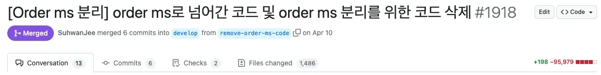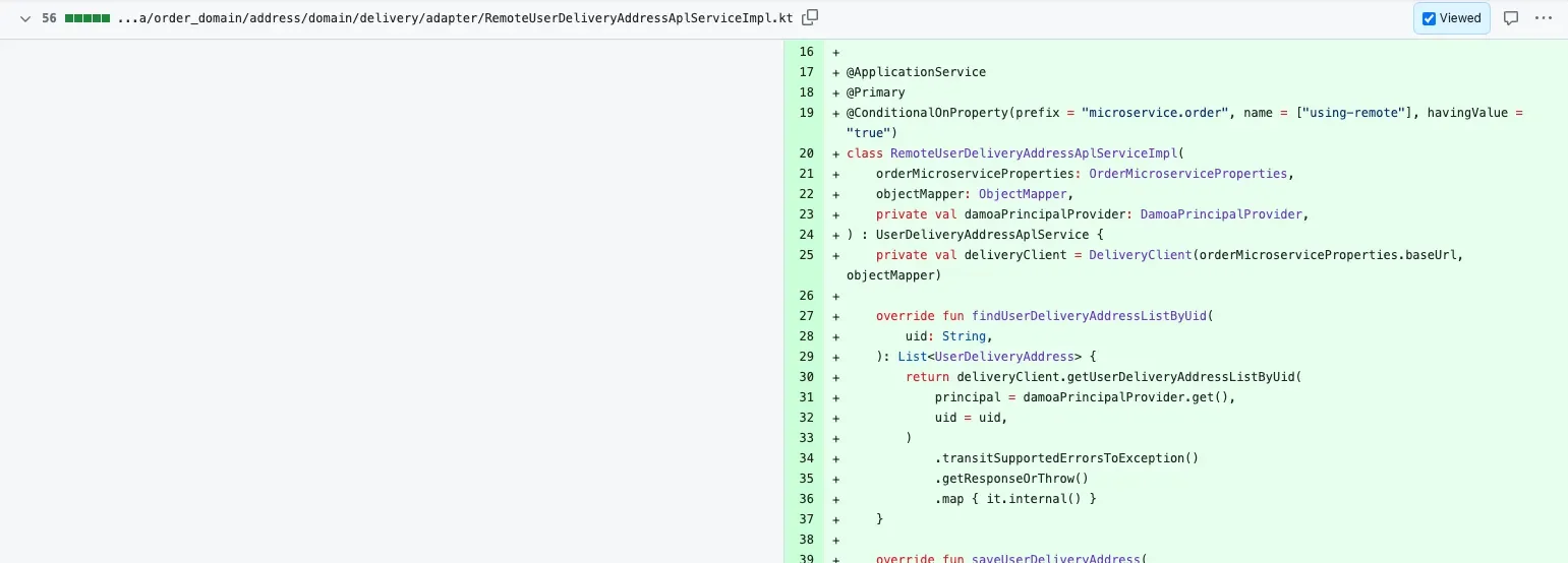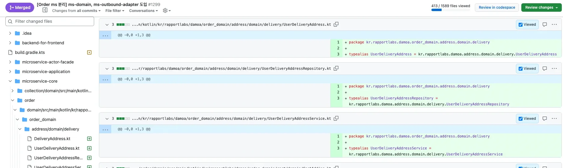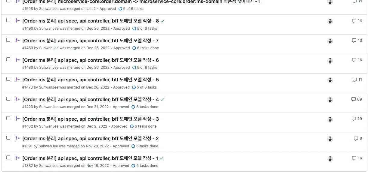 이 과정은 domain 모듈의 모든 엔티티 & 값 객체에 대해 한 번에 진행할 필요가 없으며, 일부분씩 점진적으로 변환해나가면 됩니다. 예시로, 주문 마이크로서비스 분리 시 이 과정을 8개의 PR로 끊어서 작업했습니다.