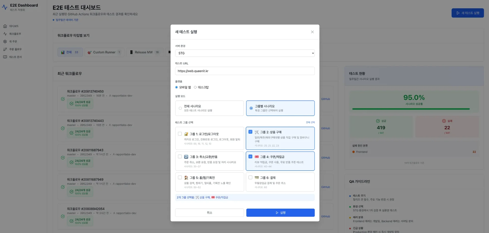 전환점은 의외로 이미 사용 중이던 도구에서 나왔습니다. E2E 자동화 테스트를 쉽게 실행하기 위해 만들어둔 웹 대시보드였는데요. 원하는 환경과 시나리오를 선택하면 테스트가 실행되고, 결과 리포트를 바로 확인할 수 있는 구조였죠.