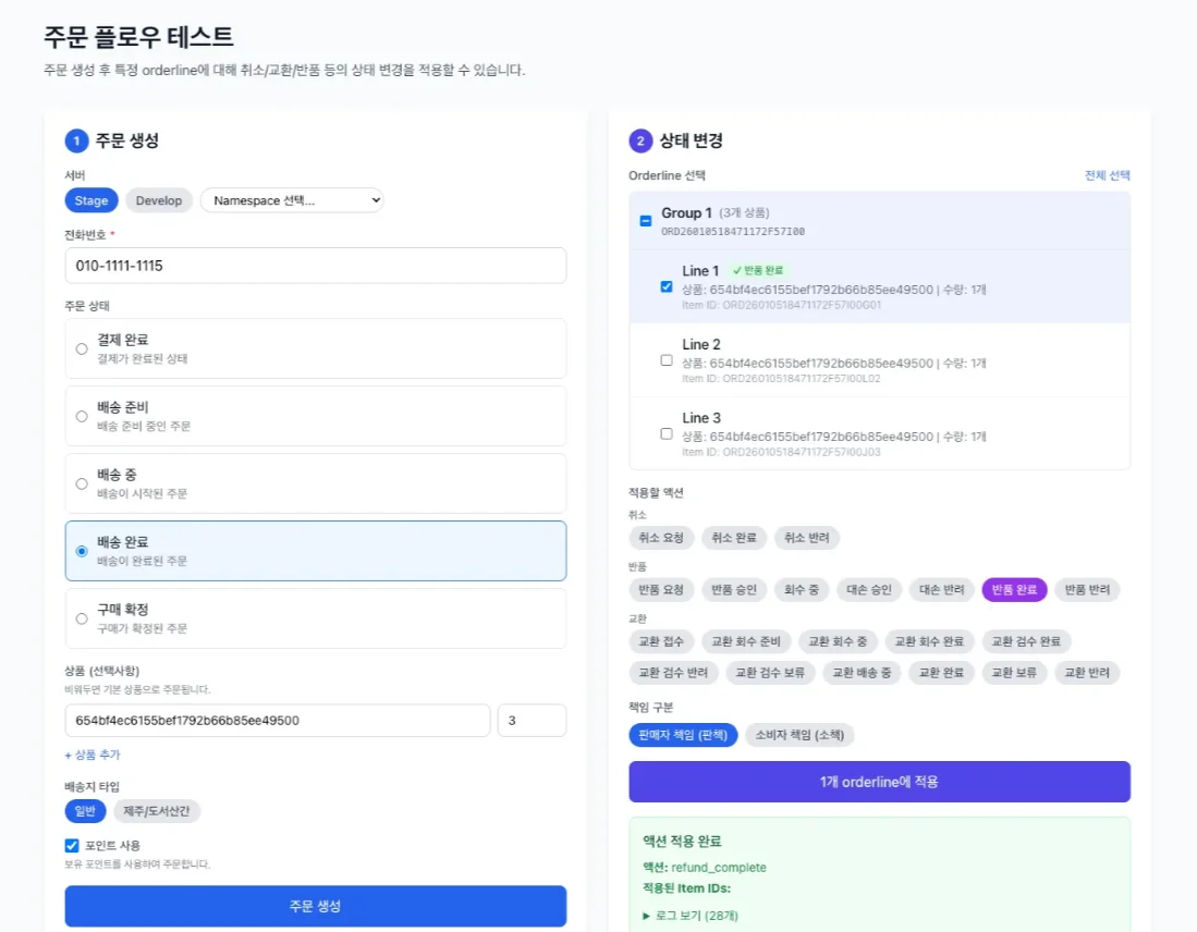 이전에는 실제 구매부터 반품/교환 요청까지 모든 단계를 직접 거쳐야 했지만, 이제는 원하는 상태의 주문을 바로 만들어 검증할 수 있습니다.