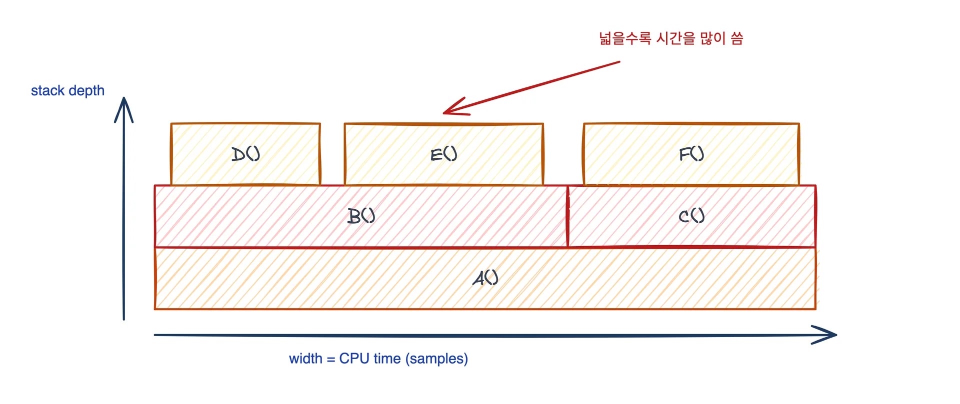 Flame Graph의 X축은 시간 비율을, Y축은 호출 스택을 나타내는데요. 예를 들어 아래와 같은 flame graph가 있다고 하면,