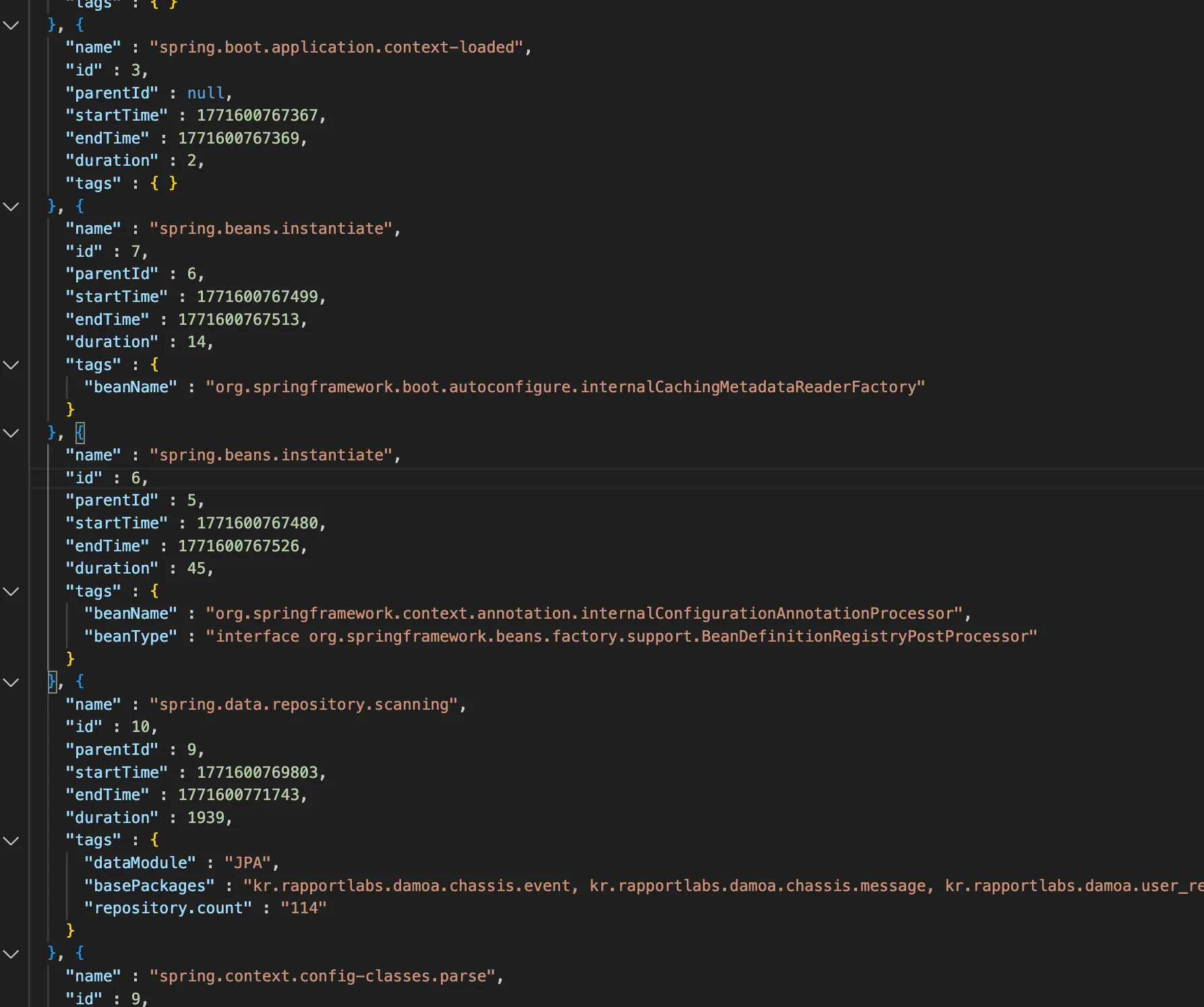 BufferingApplicationStartup은 Spring Boot 2.4에서 도입된 ApplicationStartup 구현체로, 애플리케이션 시작 과정의 각 단계를 메모리에 버퍼링하여 기록합니다. 버퍼링된 결과는 /actuator/startup 엔드포인트를 활성화하여 HTTP로 조회하거나, BufferingApplicationStartup을 Spring 컴포넌트에 주입받아 getBufferedTimeline()으로 직접 꺼낼 수도 있습니다.