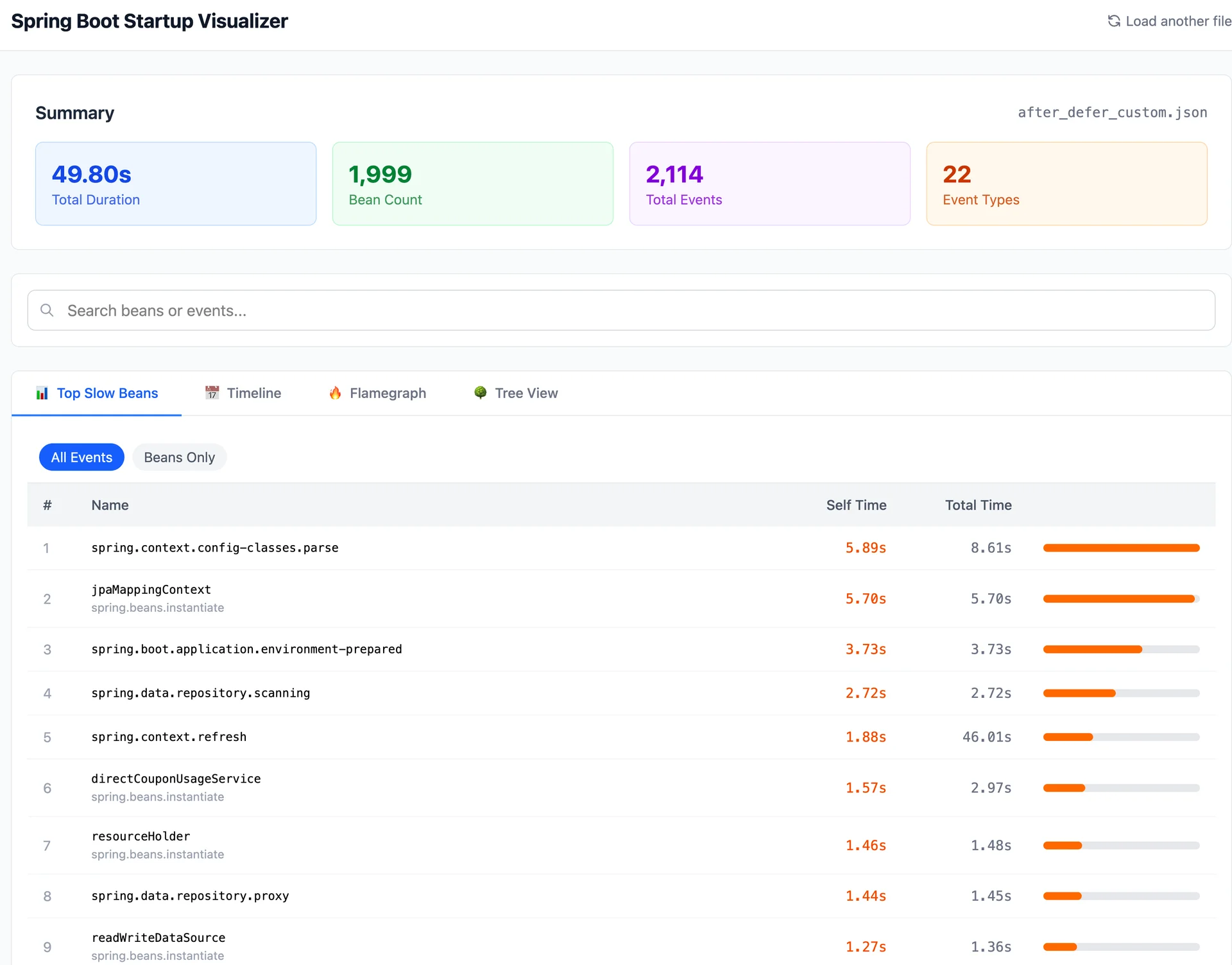 Bottom-Up으로는 더 이상 의미 있는 인사이트가 나오지 않아, Top-Down으로 전환했습니다. 초기화가 오래 걸리는 Bean을 먼저 식별하고, 소스 코드로 초기화 로직을 파악한 뒤, 그 결과를 가지고 Flame Graph를 정밀하게 drill down하는 순서입니다.