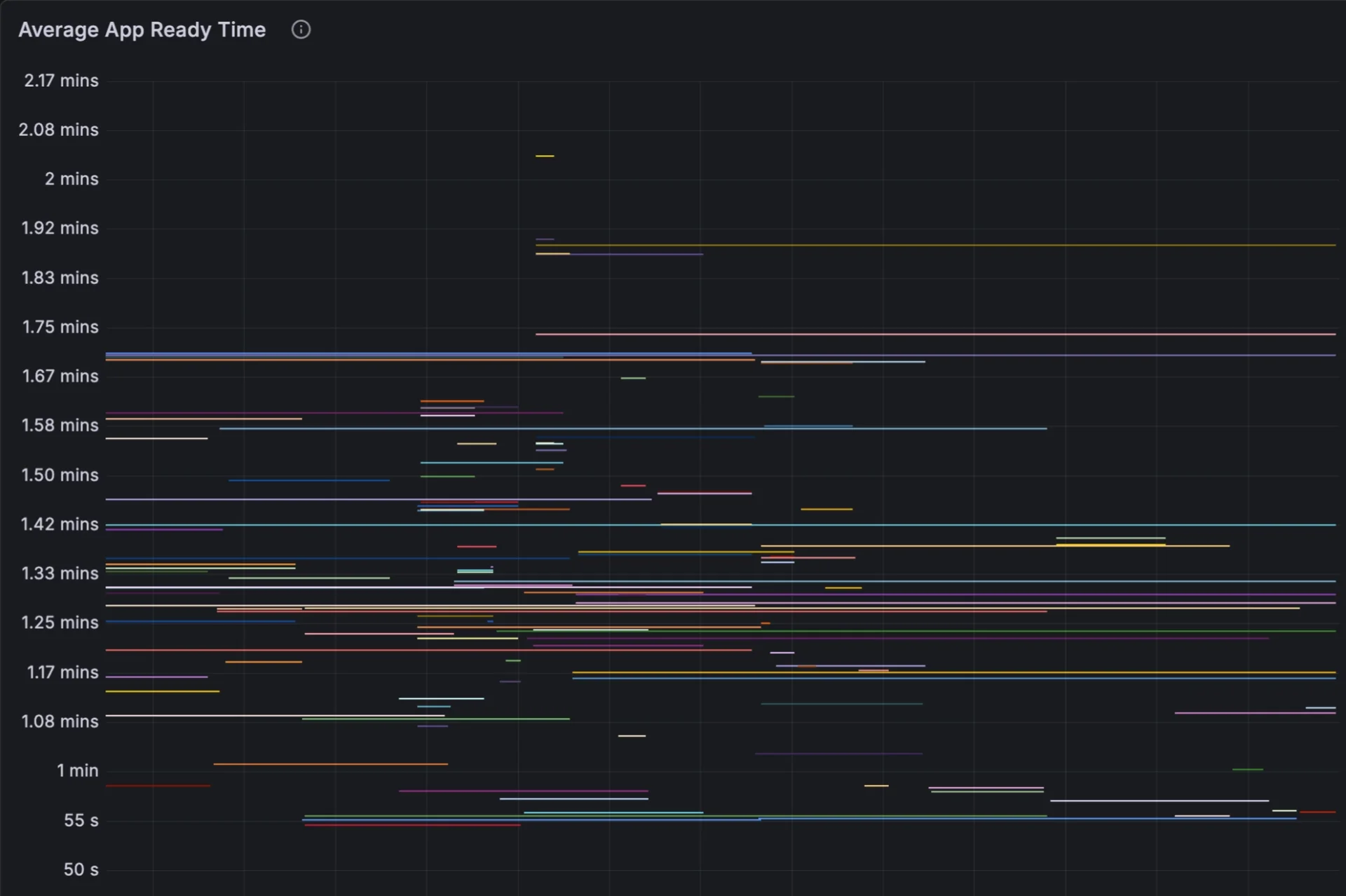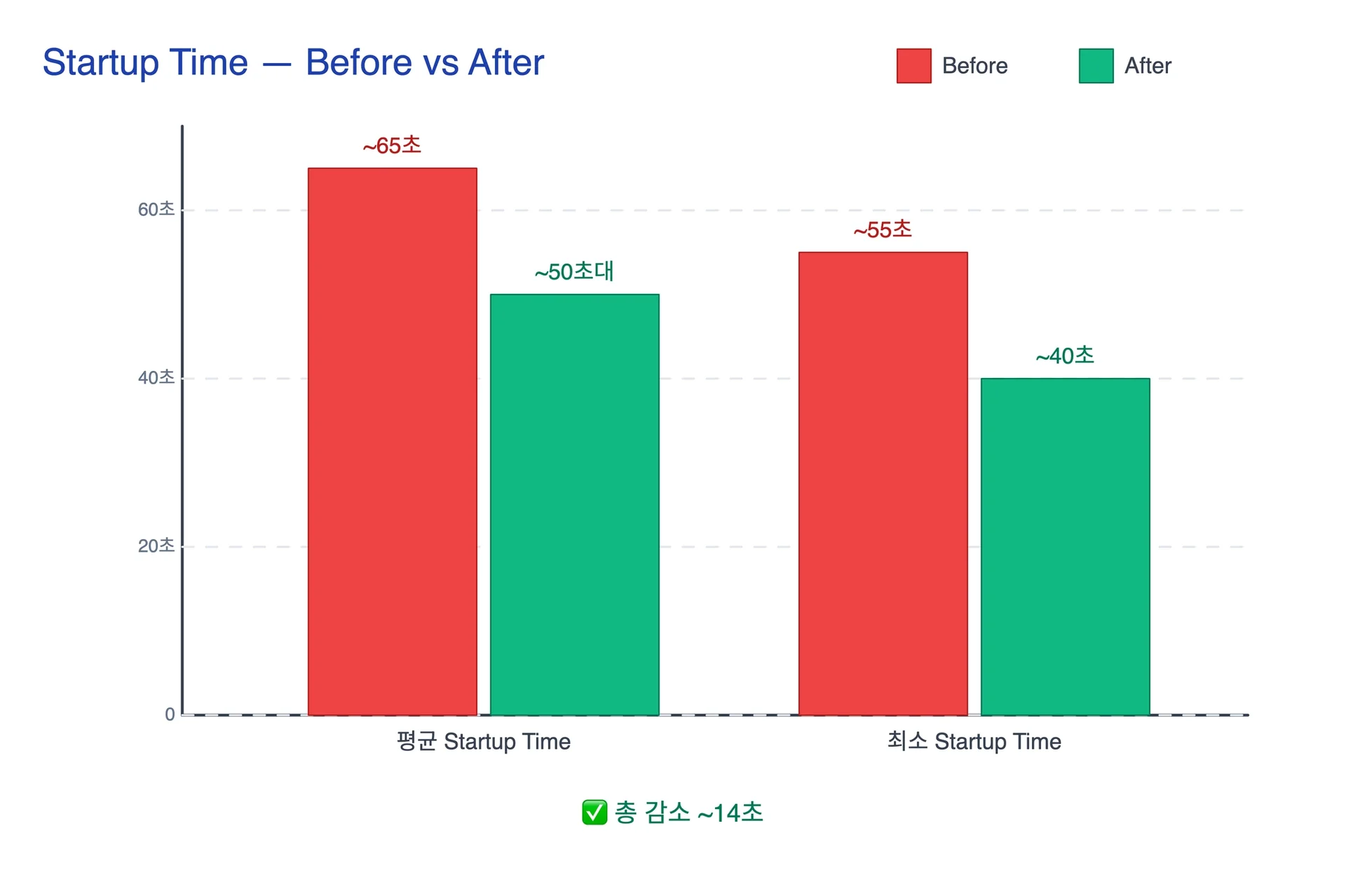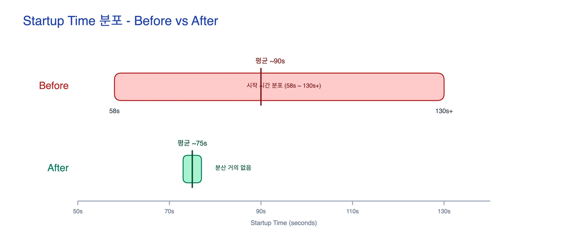 해당 코드를 배포한 결과 Startup Time 시간의 분산이 크게 줄어 안정성이 향상되었습니다. 120초를 넘는 극단적인 케이스가 완전히 사라졌습니다.