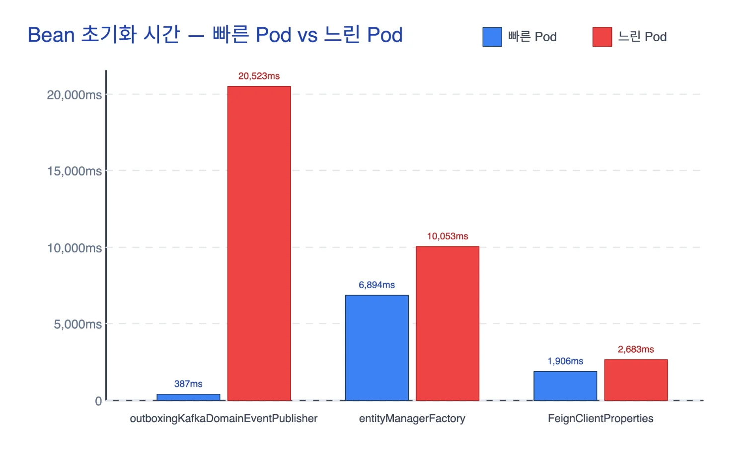 먼저 극심한 Startup Time 편차의 원인을 파악하기로 했습니다. BufferingApplicationStartup의 결과를 활용해 빠른 Pod와 느린 Pod의 단계별 소요 시간을 비교해 보니, outboxingKafkaDomainEventPublisher 빈 생성 과정이 편차의 가장 큰 원인임을 확인할 수 있었습니다.