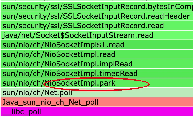 Flame Graph에서, 해당 bean의 생성 과정을 분석한 결과, 느린 Pod에서 __libc_poll 샘플이 비정상적으로 많다는 것을 발견했습니다. __libc_poll은 Linux의 poll() 시스템 콜로, 파일 디스크립터(fd)의 이벤트를 대기하는 syscall입니다. 즉, I/O 대기를 하는 샘플이 많다는 뜻인데, 호출부가 NioSocketImpl 이므로, 이는 네트워크 호출임을 알 수 있습니다.