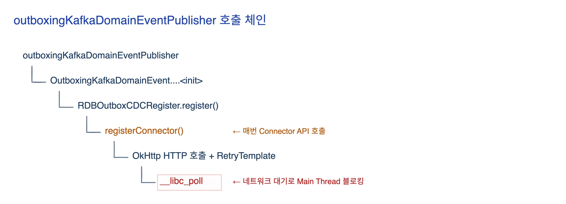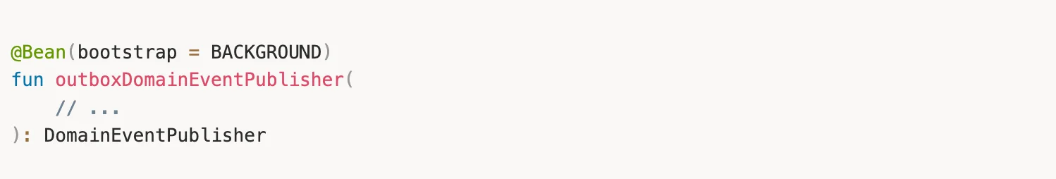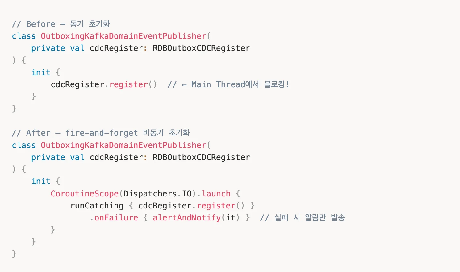 이 Bean은 사내 라이브러리에 구현되어 있던 Outbox 패턴을 지원하는 메시지 퍼블리셔입니다. 여기서 Kafka Connector 등록이 실패하더라도, 실제 서비스가 하는 일은 DB에 write 하는 것뿐이라 서비스가 동작하는 데는 영향이 없습니다. Connector 등록 실패는 알람/노티를 통해 추후에 인지하고 재처리하면 되는 문제였습니다.