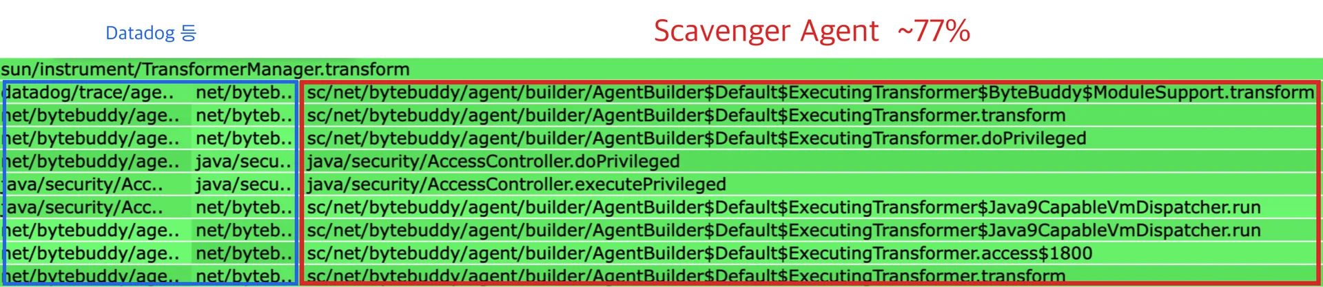 Scavenger는 dead code를 탐지하기 위한 Java Agent인데요, 클래스 로딩마다 바이트코드 변환을 수행하여 부팅을 지연시키고 있었습니다.