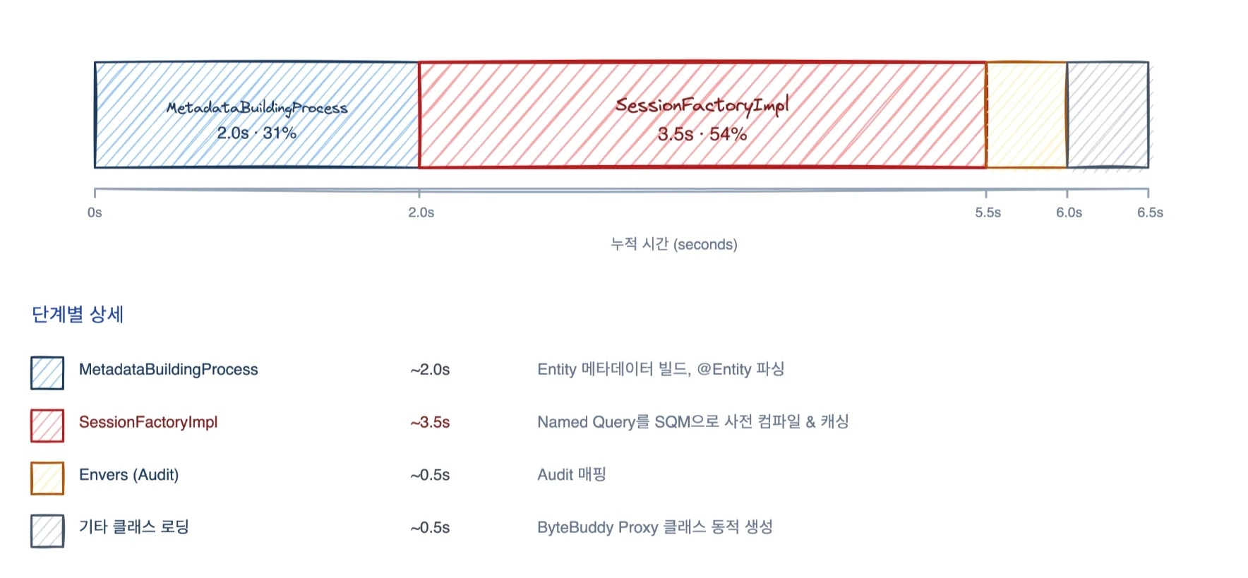 BufferingApplicationStartup 결과에서, 가장 눈에 띄게 느린 부분은entityManagerFactory(이하 EMF)였습니다(약 6.5초). Spring 소스코드와, Flame Graph를 통해, EMF 초기화의 내부 비용을 분해해 보면 다음과 같습니다.