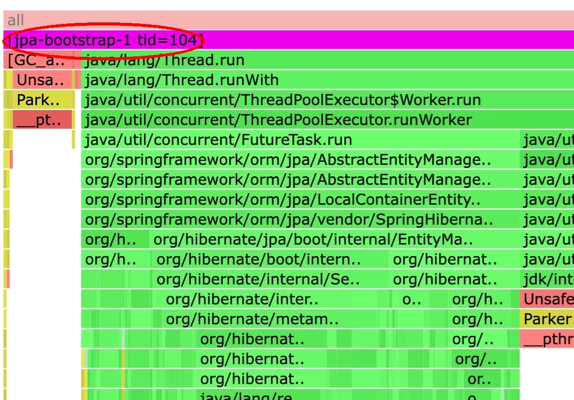 혹시 제대로 적용이 안 된 건지 Flame graph로 확인해 봤지만, EMF 초기화가 jpa-bootstrap-1 이라는 별도의 thread 하위에서 수행되는 것을 보아, 옵션은 잘 동작하는 것 같았습니다.