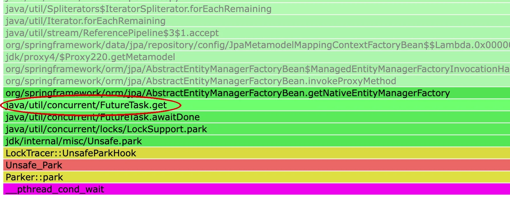 Flame Graph로 main thread 샘플을 다시 분석해 본 결과, DEFERRED mode와 EMF bootstrapExecutor를 설정한 후에도, main thread에서 여전히 getNativeEntityManagerFactory함수를 통해, EMF를 참조하는 호출이 있고, 이 때문에 Main Thread에서 EMF 완료를 대기하는 샘플이 발견되었습니다.