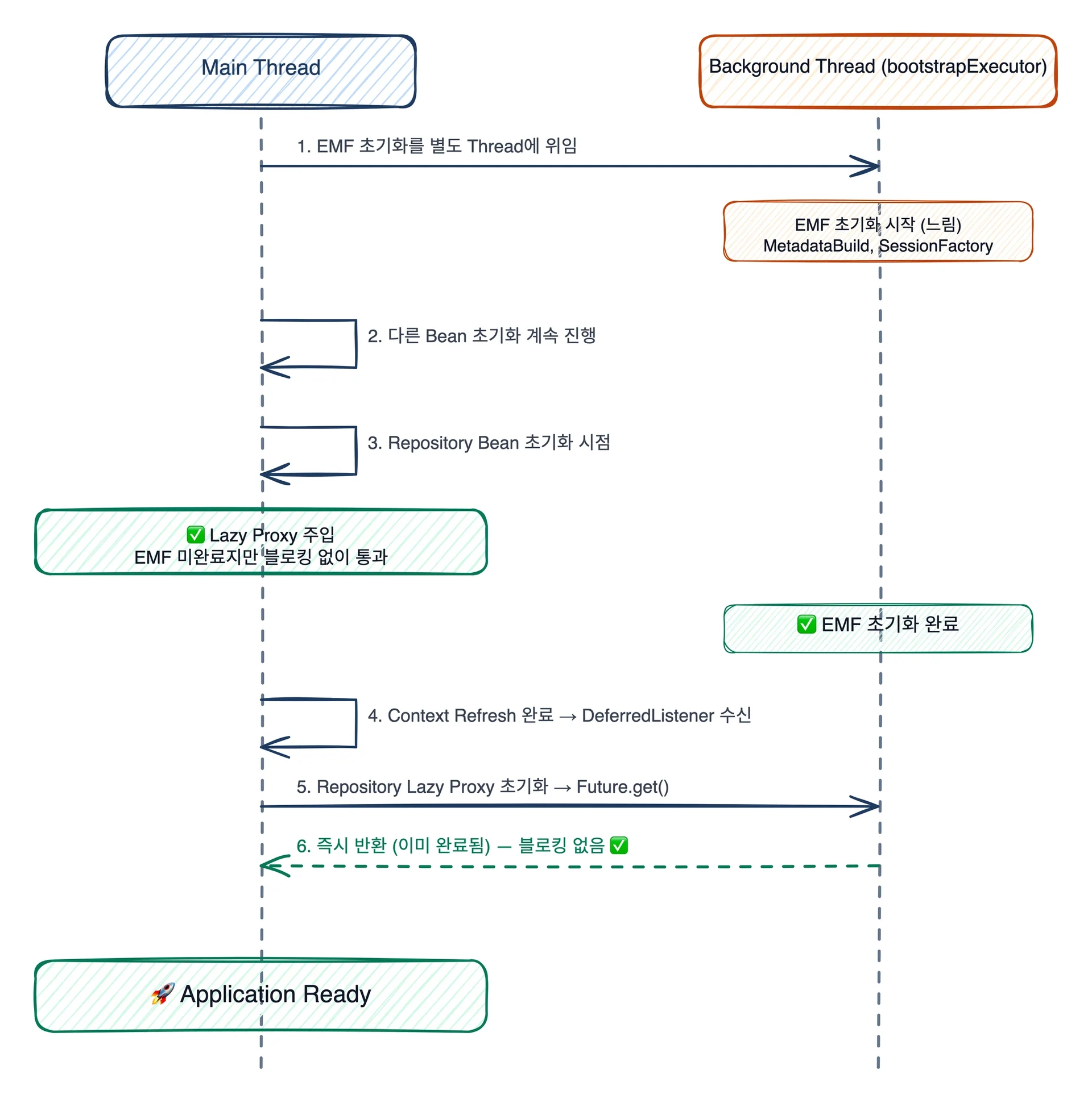 bootstrapMode: DEFERRED).EMF를 별도 Thread로 분리해도, Repository Bean이 초기화될 때 EMF를 필요로 하므로 결국 Main Thread가 EMF 완료를 기다리며 블로킹됩니다.