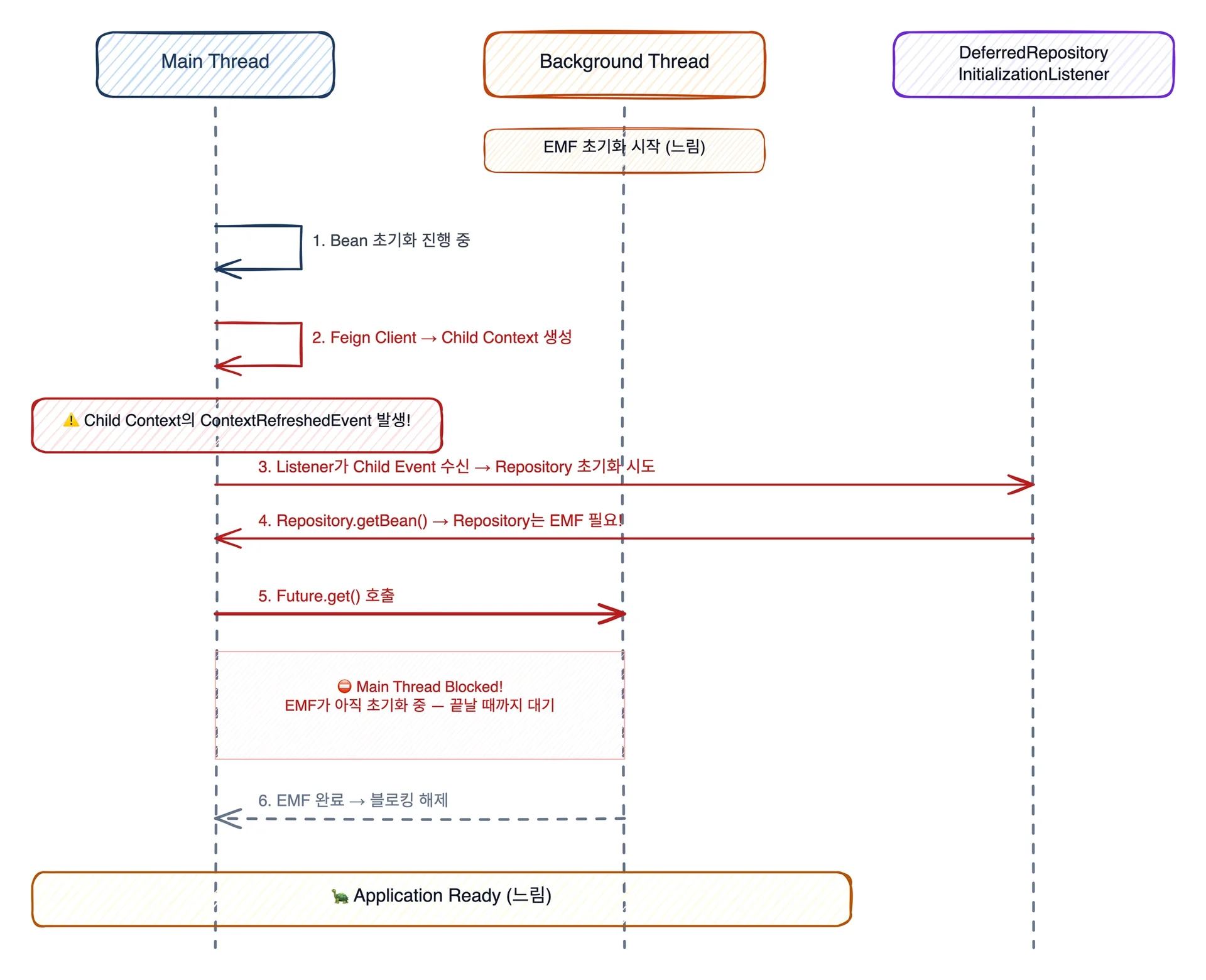 Feign Client는 내부적으로 Child Context를 생성합니다. 문제는 이 Child Context도 ContextRefreshedEvent를 발생시키고, 앞서 봤던 DeferredRepositoryInitializationListener가 Child Context의 이벤트에도 반응한다는 것이었습니다. 결과적으로 의도치 않은 시점에 Repository 초기화가 이루어졌고, 이 시점에 EMF가 아직 초기화 중이라면 Main Thread가 이를 기다려야 했습니다.