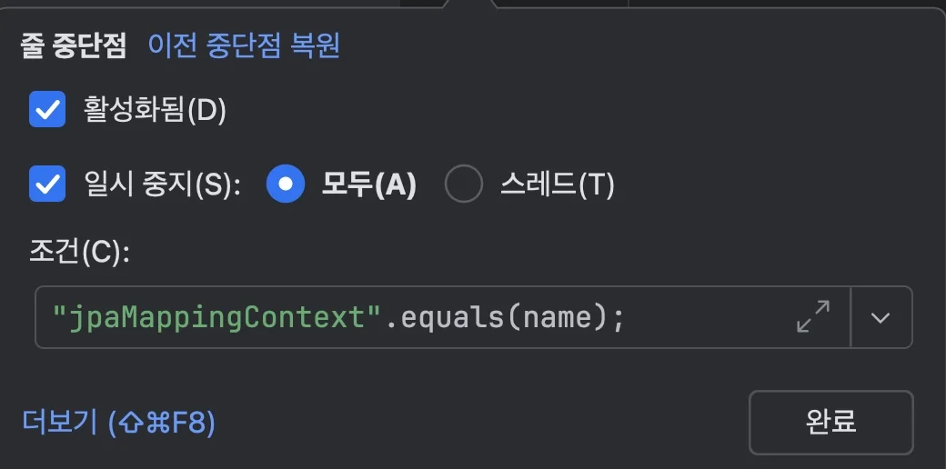 bean이 초기화될 때, spring은 의존하는 bean들을 getBean함수로 가져옵니다. 따라서 getBean 내부에 break point 찍고, 요구하는 bean의 이름이jpaMappingContext 일 때만 멈추도록 조건을 설정한 뒤, stack trace 따라 올라가면 상위 스택에서 어떤 bean을 만들고 있는지 볼 수 있습니다.