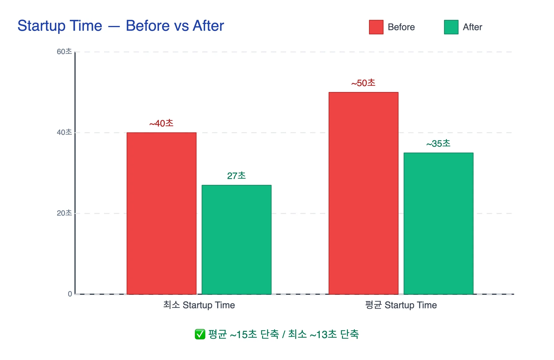 로컬에서 구동 시간을 측정한 결과 부트업 시간이 기존 대비 50% 단축된 결과를 확인했습니다.