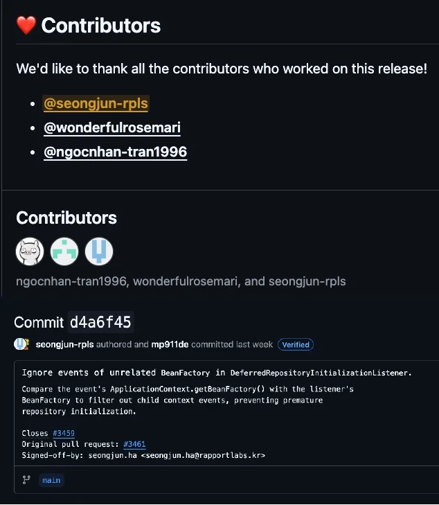 동시에 spring-data-commons에 이슈를 제보하고 문제를 수정하여 PR을 생성 했습니다. PR은 main branch에 머지되었으며, v3.5.10부터 공식 적용될 예정입니다. 우선 임시 패치로 이 문제를 회피하고, spring-data-commons 정식 릴리즈 후에 임시 패치를 제거하고 Spring Boot 버전업으로 대체할 계획입니다.