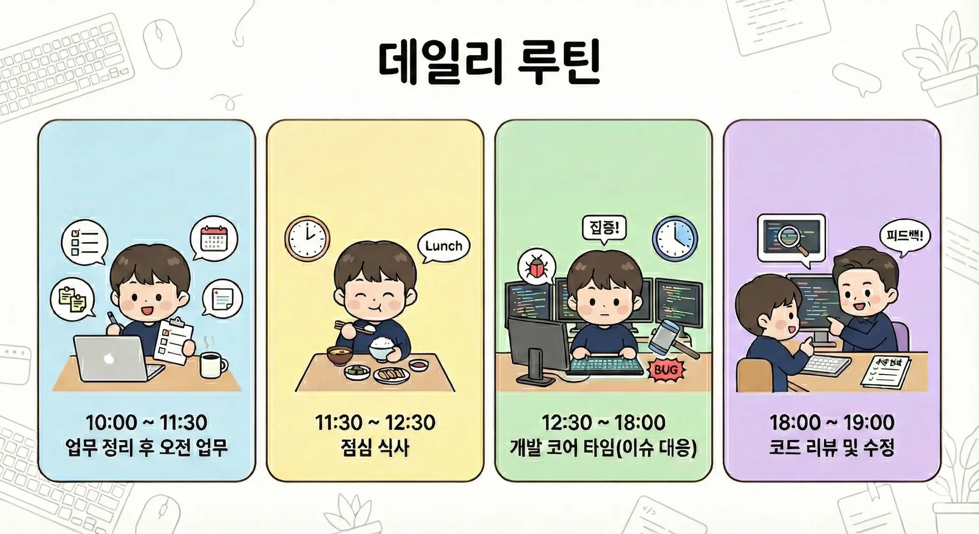 ⏰ [업무 정리 후 오전 업무 → 점심 식사 → 개발 코어 타임 / 이슈 대응 → 코드 리뷰 및 수정]의 루틴으로 일하고 있어요. 업무 루틴 자체는 단조롭게 느껴질 수 있지만 실시간으로 이슈에 대응하며 코드를 리뷰하다 보면 하루가 순식간에 지나가곤 합니다.